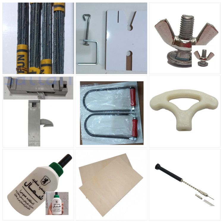 پک معرق کاری شامل 1-کمان اره تسمه ای ایرانی یک عدد همراه با 4عدد پیچ خروسک چینی 2-مشتی یک عدد 3-تخته پیشکار همراه با گیره یک عدد 4-چسب چوب شمال پمادی یک عدد 5-اره مویی دو صفر مارک تایفون چینی 6-کمان گیر یک عدد ۷ -مته فشاری همراه با ۵ عدد مته ۸ دو ورق تخته سه لایی اندازه ۲۰در ۳۰