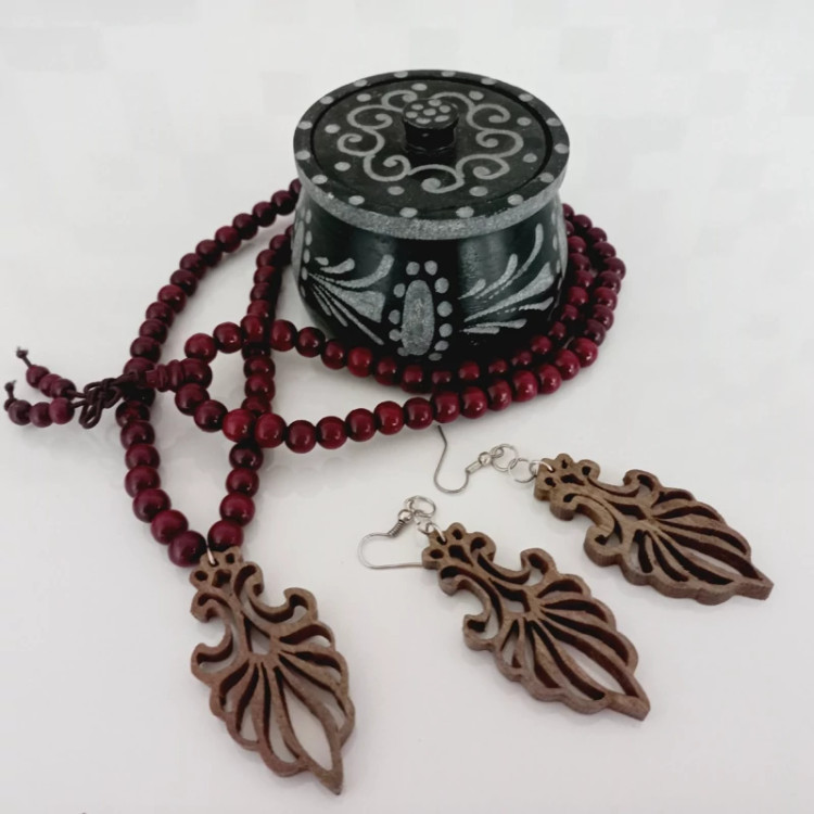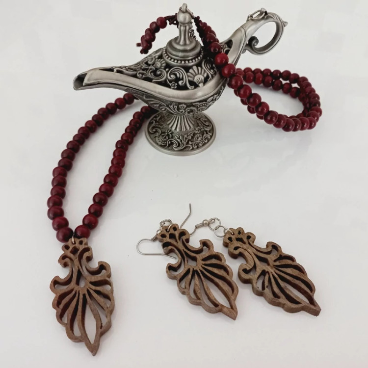گردنبند چوبی بسیار زیبا در طرحهای متنوع همراه با گوشواره چوبی مناسب برای هدیه جنس چوب گردو تیره
