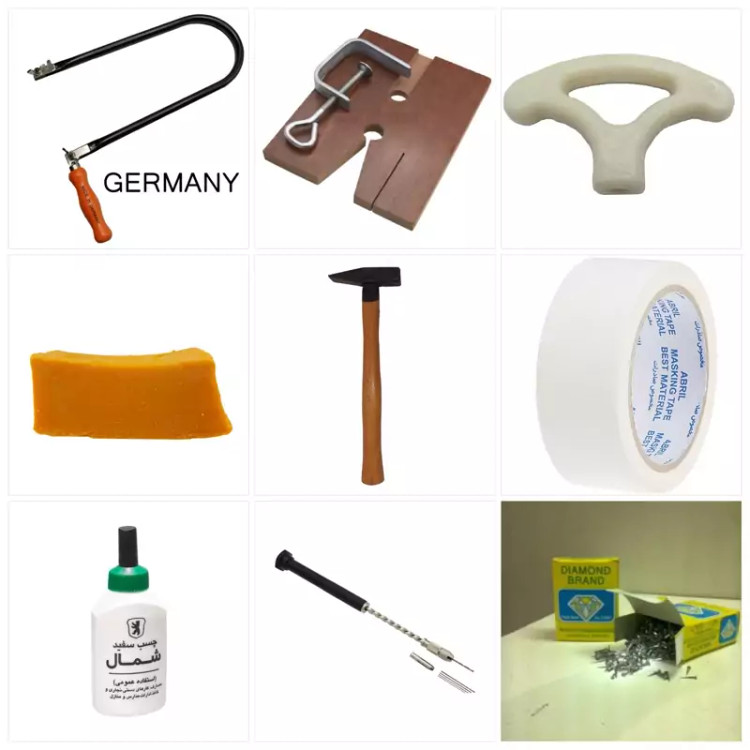 پک معرق کاری شامل کمان اره اصل آلمانی-مشتی-پیشکار-چسب چوب- چسب کاغذی -مته فشاری همراه با 5 عدد مته سایز بندی مختلف-چکش 100گرمی -میخ ریز 50 گرم- اره مویی دوصفر تمپو آلمانی اصل -سنباده دو ورق کمانگیر